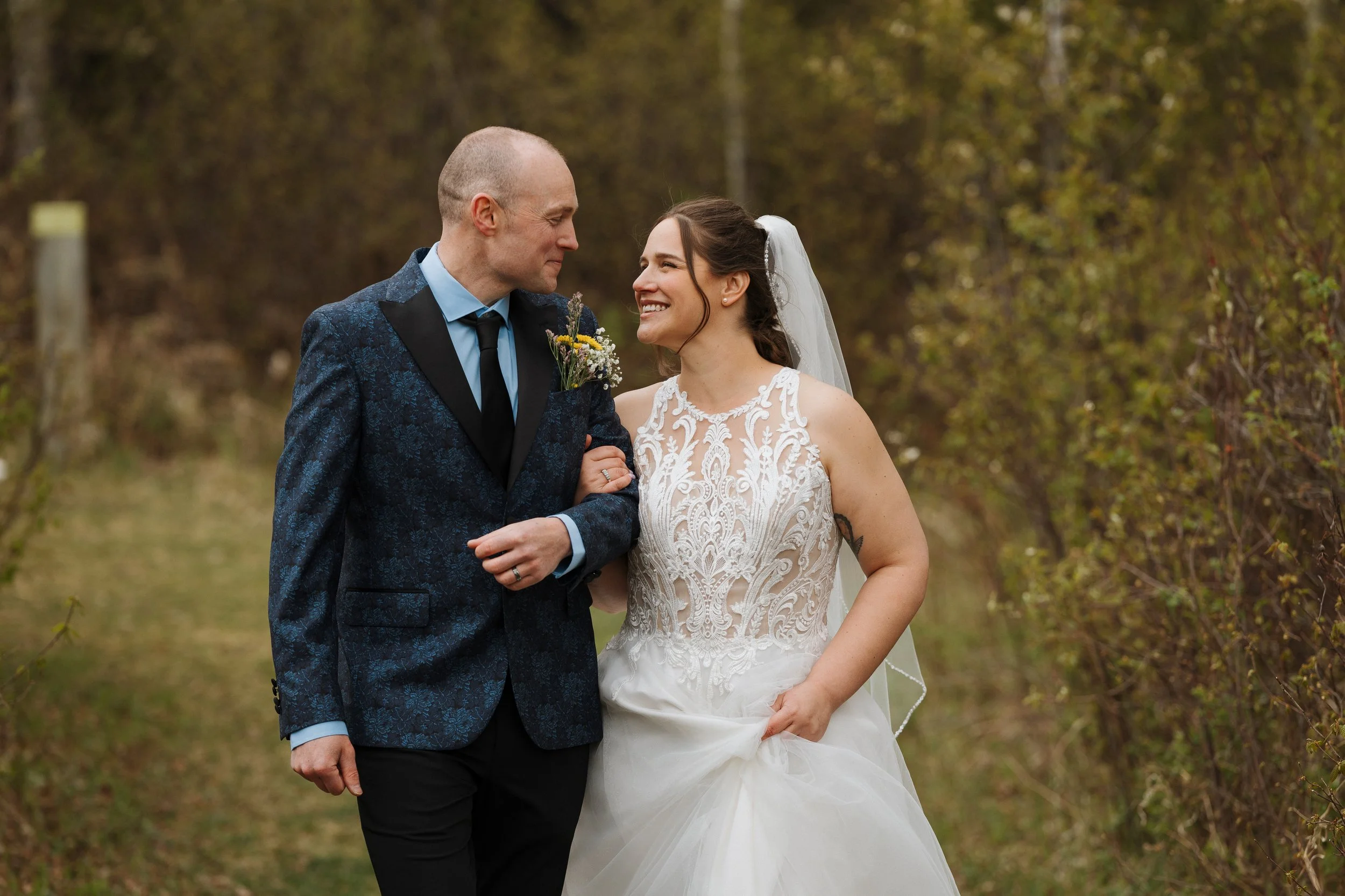 In the heart of Alberta, nestled amidst the serene wilderness east of Edmonton, lies a hidden gem of natural beauty - Beaverhills Biosphere. Imagine a canopy of trees stretching above, their leaves dancing in the soft breeze. The air is filled with the sweet scent of cherry blossom, and the sounds of birdsong (ok, ok, the HONK of Canadian Geese!) provide the perfect soundtrack to this idyllic scene. This is the backdrop C&D chose for their micro wedding, a place which had special meaning to them, as it was actually the spot David had proposed.