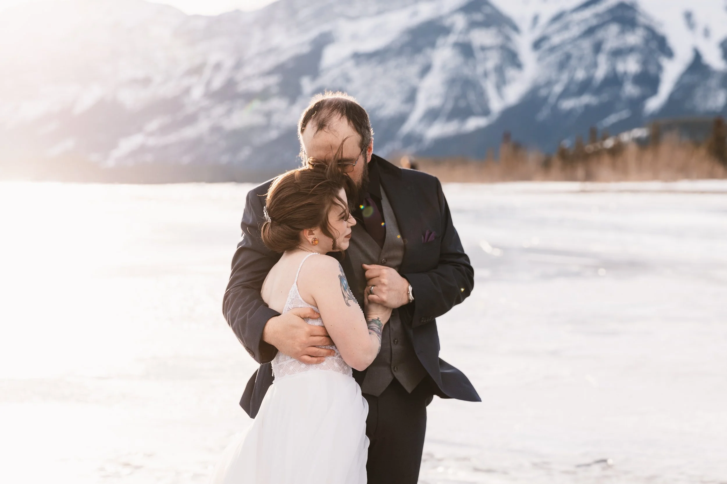 Another option is a late afternoon ceremony, followed by a helicopter flight and a breathtaking bride and groom sunset session. We’ve flown with the good folks at Rockies Heli Canada before and they are excellent. They are on the southern end of Abraham Lake, closer to the Banff border, and have been offering flights throughout their little slice of paradise for over 20 years. They can whisk you off into the Alpine and to the best sunset spots, the stunning peaks of Banff as your backdrop. You can even say ‘i do’ on top of a mountain- perfect if you are eloping just the two of you- what’s more, it’s surprisingly not break-the-bank expensive- at the time of writing it was under $400 per person. The below gallery shows a heli-elopement where we couldn’t get up into the alpine as there was too much snow- but in all fairness it was January!! Our couple had already tied the knot at a registry a few weeks earlier. Read all about our adventure with them here.